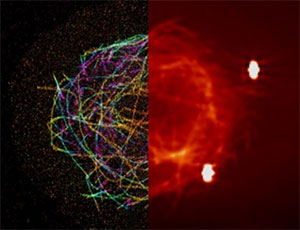 A super-resolution image (left) of the molecular scaffolding, called microtubules, in the cell of a fruit fly, combined with a conventional microscopy image (right) of the same cell for comparison. Credit: Jim and Cathy Galbraith, Glob Shtengel, Harald Hoss/HHMI/Janelia Research Campus.