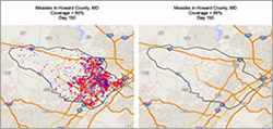 in selected U.S. cities following a single measles case, and detailed images and diagrams of various viruses