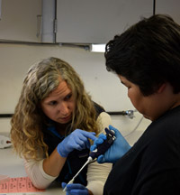 Lori Gildehaus teaches a student in Barrow, Alaska, how to use a pipette for laboratory techniques like the polymerase chain reaction. Credit, UAF BLaST.