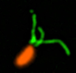 Swimming bacteria have another outer structure that also could be involved in sensing a surface. Urs Jenal and colleagues at the University of Basel, Switzerland, also studied Caulobacter crescentus and the action of its flagellum, a rotating tail that powers the bacterium around like a propeller. The flagellum extends from one end of the swimming cell and works in tandem with the pili. In a result mirroring that of Brun’s team, Jenal and his team concluded that when a cell’s flagellum touches a surface and can no longer rotate, the motor inside the cell that powers the flagellum stops, providing the signal to start attaching.