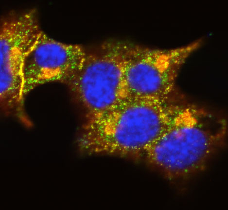 The interactions of TMEM24 protein (green) and insulin (red) in pancreatic beta cells are shown in yellow. Credit: Balch Lab, the Scripps Research Institute.