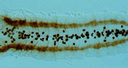 The glial cells (black dots) and nerve cells (brown bands) in this developing fruit fly nerve cord formed normally despite the absence of the SPITZ protein, which blocks their impending suicide. The HID protein, which triggers suicide, is also lacking in this embryo.