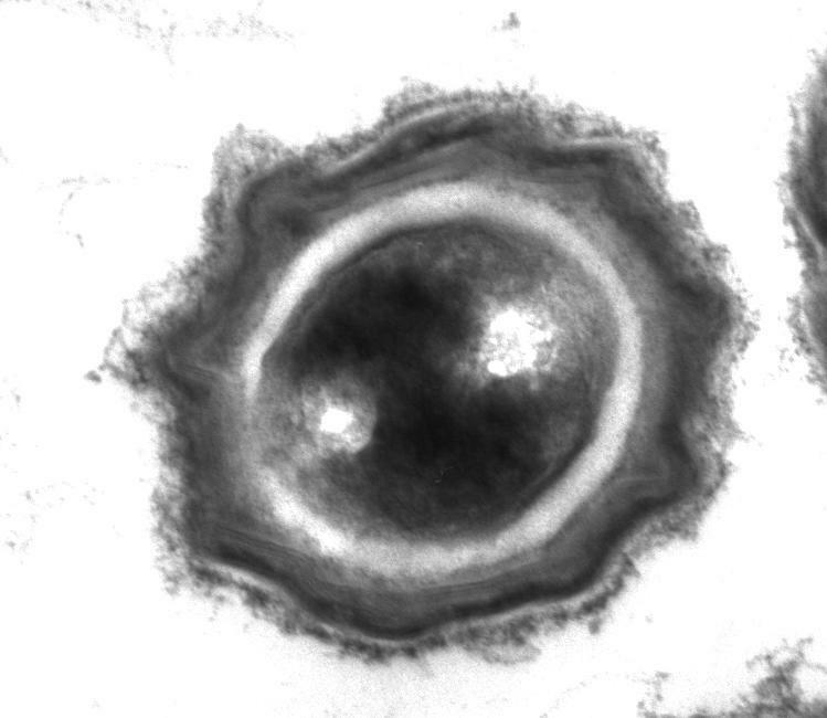 Image Gallery: Bacterial spore Image Download Full Quality (0.0MB) ID 2752 A spore from the bacterium Bacillus subtilis shows four outer layers that protect the cell from harsh environmental conditions. Source Patrick Eichenberger, New York University Topics Cells