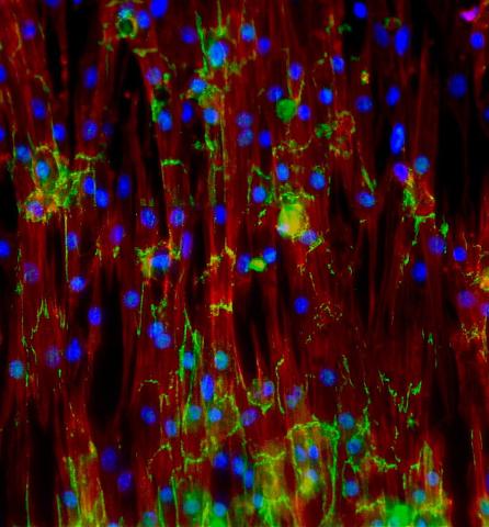 This image shows neonatal mouse heart cells. These cells were grown in the lab on a chip that aligns the cells in a way that mimics what is normally seen in the body. Green shows the protein N-cadherin, which indicates normal connections between cells. Red indicates the muscle protein actin, and blue indicates the cell nuclei. The work shown here was part of a study attempting to grow heart tissue in the lab to repair damage after a heart attack. Image and caption information courtesy of the California Institute for Regenerative Medicine. Related to images 3281 and 3283.