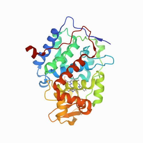 The enzyme CCP is found in the mitochondria of baker’s yeast. Scientists study the chemical reactions that CCP triggers, which involve a water molecule, iron, and oxygen. This structure was determined using an X-ray free electron laser.