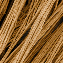 This image shows collagen, a fibrous protein that’s the main component of the ECM. Collagen is a strong, rope-like molecule that forms stretch-resistant fibers. The most abundant protein in our bodies, collagen accounts for about a quarter of our total protein mass. Among its many functions is giving strength to our tendons, ligaments and bones and providing scaffolding for skin wounds to heal. There are about 20 different types of collagen in our bodies, each adapted to the needs of specific tissues.