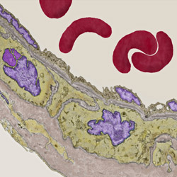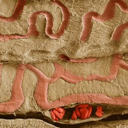 This image shows the ECM on the surface of a soleus (lower calf) muscle in light brown and blood vessels in pink. Near the bottom of the photo, a vessel is opened up to reveal red blood cells. Scientists know less about the ECM in muscle than in other tissues, but studies are making it increasingly clear that the ECM is critical to muscle function, and disruption of the ECM has been associated with many muscle disorders. Scientists have also found that the ECM in muscles can store and release growth factors, suggesting that it might play a key role in cellular communication.