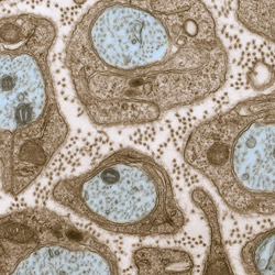 Although there is less ECM in nervous tissue than in connective tissue, it is found between the stems (axons) of nerve cells. In this image, brown-colored Schwann cells act like insulation around the blue-colored nerve axons. The somewhat colorless areas between the Schwann cells are ECM. The tiny brown spots within the ECM are collagen fibers. A broader view of this image also includes two large, reddish brown nuclei.