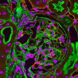 This high-magnification photo of a kidney shows another role of the ECM. It can form a thin, flexible mat, known as a basal lamina, between connective tissue and other tissues. In the kidney, an unusually thick basal lamina acts as a filter that controls which molecules are allowed to pass from the bloodstream into urine. Red marks the main protein in basal lamina, known as laminin; purple marks DNA; and green marks the structural protein known as actin.