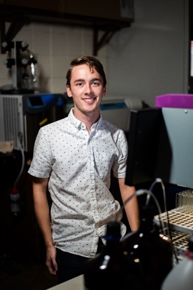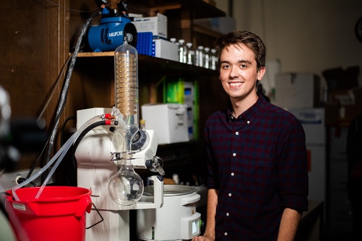 Caleb standing in front of a rotary evaporator used to remove solvents from samples through evaporation. Credit: Pittsburg State University.