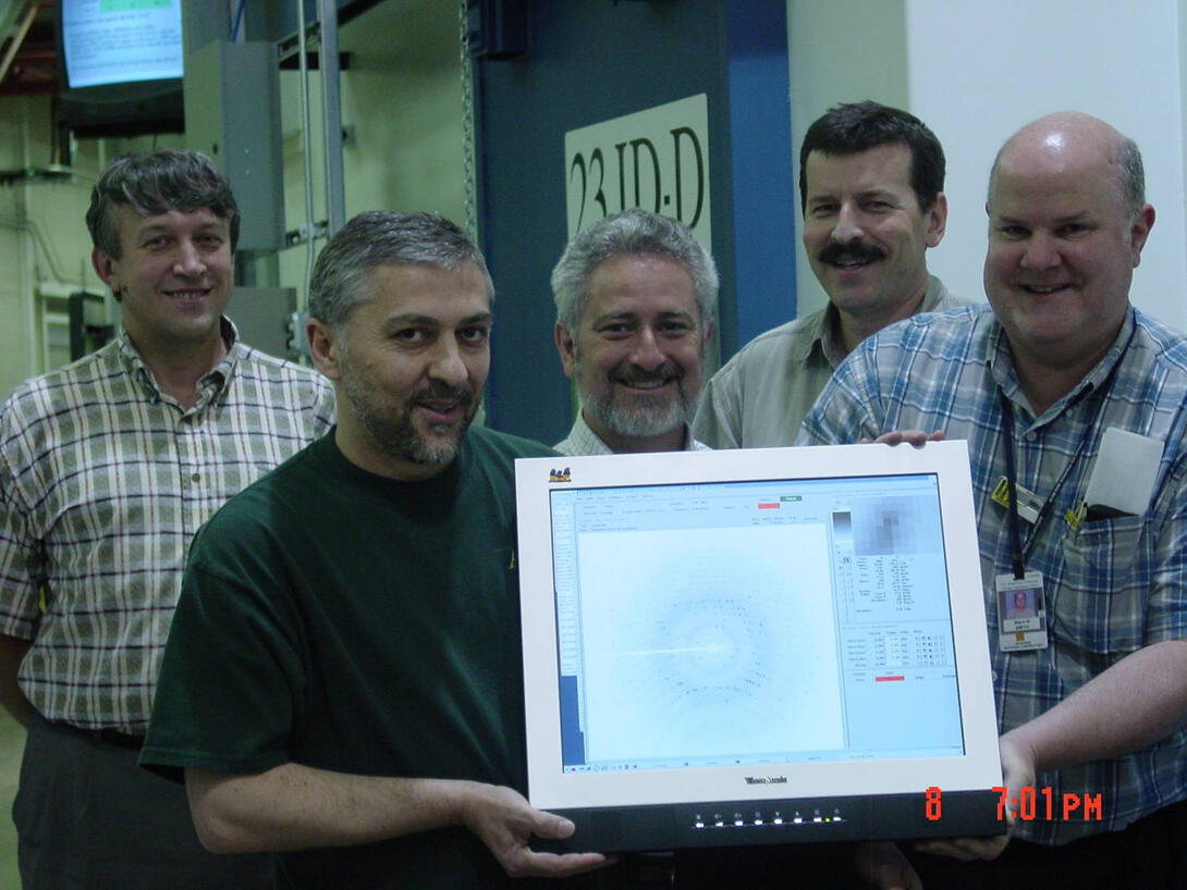 Scientists from Argonne National Laboratory's Advanced Photon Source (APS) display the first X-ray diffraction pattern obtained from a protein crystal using a split X-ray beam, the first of its kind at APS. The scientists shown are (from left to right): Oleg Makarov, Ruslan Sanishvili, Robert Fischetti (project manager), Sergey Stepanov, and Ward Smith.