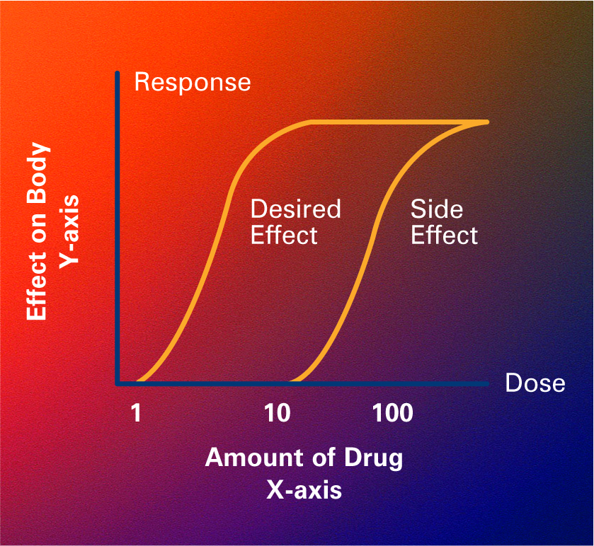 Dose-response curves determine how much of a drug (X-axis) causes a particular effect, or a side effect, in the body (Y-axis). Featured in Medicines By Design.