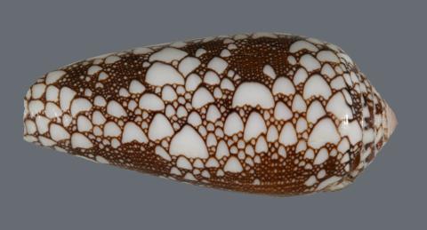 A shell from the venomous cone snail Conus omaria, which lives in the Pacific and Indian oceans and eats other snails. University of Utah scientists discovered a new toxin in this snail species' venom, and say it will be a useful tool in designing new medicines for a variety of brain disorders, including Alzheimer's and Parkinson's diseases, depression, nicotine addiction and perhaps schizophrenia.