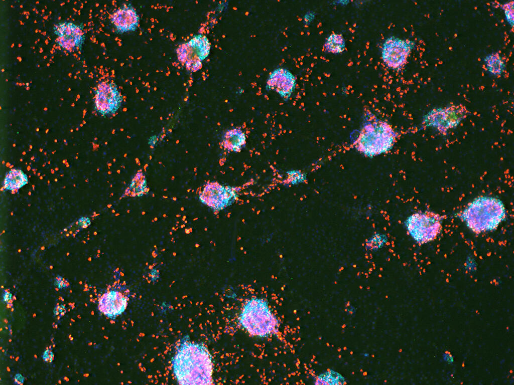 Human embryonic stem cells were differentiated into cells like those found in the pancreas (blue), which give rise to insulin-producing cells (red). When implanted in mice, the stem cell-derived pancreatic cells can replace the insulin that isn't produced in type 1 diabetes. Image and caption information courtesy of the California Institute for Regenerative Medicine.