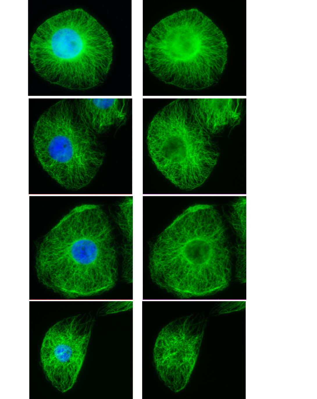 These images show frog cells in interphase. The cells are Xenopus XL177 cells, which are derived from tadpole epithelial cells. The microtubules are green and the chromosomes are blue. Related to 3442.
