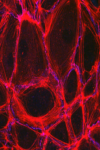 The structure of the endothelium, the thin layer of cells that line our arteries and veins, is visible here. The endothelium is like a gatekeeper, controlling the movement of materials into and out of the bloodstream. Endothelial cells are held tightly together by specialized proteins that function like strong ropes (red) and others that act like cement (blue).
