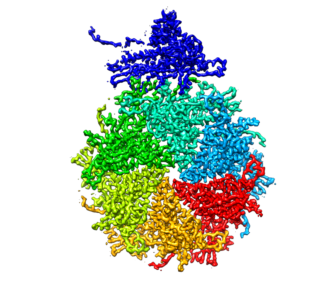 Detail of a subunit of the capsid, or outer cover, of bacteriophage P22, a virus that infects the Salmonella bacteria. Cryo-electron microscopy (cryo-EM) was used to capture details of the capsid proteins, each shown here in a separate color. Thousands of cryo-EM scans capture the structure and shape of all the individual proteins in the capsid and their position relative to other proteins. A computer model combines these scans into the image shown here. Related to image 5874.