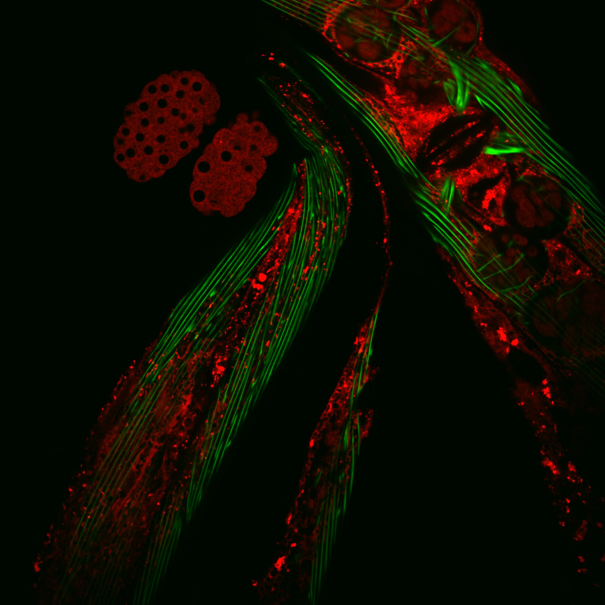 Closeup of C. elegans, tiny roundworms, with a ribosomal protein glowing red and muscle fibers glowing green. Researchers used these worms to study a molecular pathway that affects aging. The ribosomal protein is involved in protein translation and may play a role in dietary restriction-induced longevity. Image created using confocal microscopy.