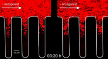Bioengineers were able to coax bacteria to blink in unison on microfluidic chips. This image shows a small chip with about 500 blinking bacterial colonies or biopixels. Jeff Hasty Lab, UC San Diego View MediaFocal adhesions
