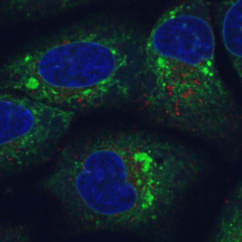 Embryonic stem cells store pre-activated Bax (red) in the Golgi, near the nucleus (blue). Featured in the June 21, 2012, issue of Biomedical Beat.