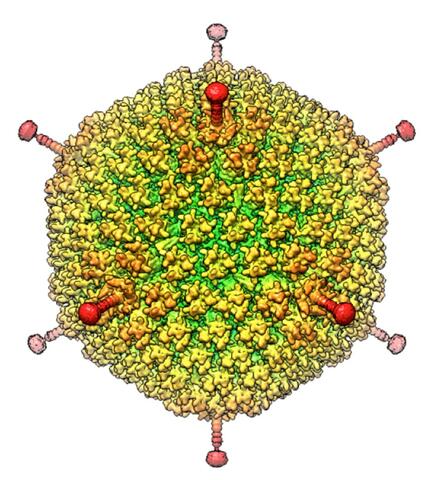 The illustration shows the capsid of human immunodeficiency virus (HIV) whose molecular features were resolved with cryo-electron microscopy (cryo-EM). On the left, the HIV capsid is "naked," a state in which it would be easily detected by and removed from cells. However, as shown on the right, when the viral capsid binds to and is covered with a host protein, called cyclophilin A (shown in red), it evades detection and enters and invades the human cell to use it to establish an infection. To learn more about how cyclophilin A helps HIV infect cells and how scientists used cryo-EM to find out the mechanism by which the HIV capsid attaches to cyclophilin A, see this news release by the University of Illinois. A study reporting these findings was published in the journal Nature Communications.