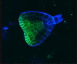 A replica of a human retina grown from stem cells. It shows rod photoreceptors (nerve cells responsible for dark vision) in green and red/green cones (nerve cells responsible for red and green color vision) in red. The cell nuclei are stained blue. This image was captured using a confocal microscope.