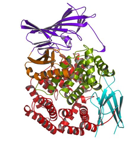 This image represents the structure of TrpRS, a novel member of the tryptophanyl tRNA-synthetase family of enzymes. By helping to link the amino acid tryptophan to a tRNA molecule, TrpRS primes the amino acid for use in protein synthesis. A cluster of iron and sulfur atoms (orange and red spheres) was unexpectedly found in the anti-codon domain, a key part of the molecule, and appears to be critical for the function of the enzyme. TrpRS was discovered in Thermotoga maritima, a rod-shaped bacterium that flourishes in high temperatures.