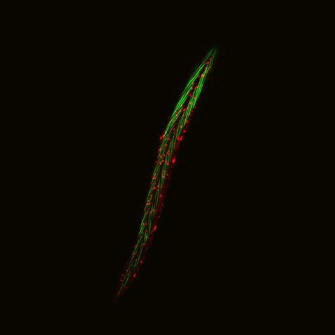 Green and yellow fluorescence mark the processes and cell bodies of some C. elegans neurons. Researchers have found that the strategies used by this tiny roundworm to control its motions are remarkably similar to those used by the human brain to command movement of our body parts. From a November 2011 University of Michigan news release.
