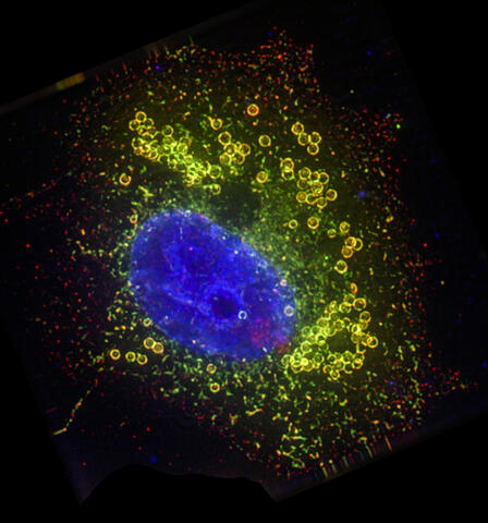 3624: Fibroblasts with nuclei in blue, energy factories in green and the actin cytoskeleton in red