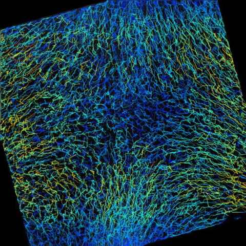 This image results from a research project to visualize which regions of the adult fruit fly (Drosophila) brain derive from each neural stem cell. First, researchers collected several thousand fruit fly larvae and fluorescently stained a random stem cell in the brain of each. The idea was to create a population of larvae in which each of the 100 or so neural stem cells was labeled at least once. When the larvae grew to adults, the researchers examined the flies’ brains using confocal microscopy. With this technique, the part of a fly’s brain that derived from a single, labeled stem cell “lights up.” The scientists photographed each brain and digitally colorized its lit-up area. By combining thousands of such photos, they created a three-dimensional, color-coded map that shows which part of the Drosophila brain comes from each of its ~100 neural stem cells. In other words, each colored region shows which neurons are the progeny or “clones” of a single stem cell. This work established a hierarchical structure as well as nomenclature for the neurons in the Drosophila brain. Further research will relate functions to structures of the brain.