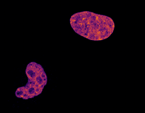 Two cells over a 2-hour period. The one on the bottom left goes through programmed cell death, also known as apoptosis. The one on the top right goes through cell division, also called mitosis. This video was captured using a confocal microscope.