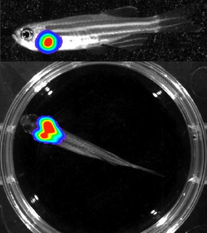 Luciferase-based imaging enables visualization and quantification of internal organs and transplanted cells in live adult zebrafish. In this image, a cardiac muscle-restricted promoter drives firefly luciferase expression. This is the lateral and overhead (Bottom) view.