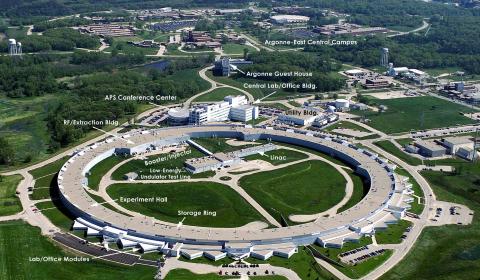 Researchers used cryo-electron tomography (cryo-ET) to capture images of a rat pancreas cell that were then compiled and color-coded to produce a 3D reconstruction. Visible features include the folded sacs of the Golgi apparatus (copper), transport vesicles (medium-sized dark-blue circles), microtubules (neon-green rods), a mitochondria membrane (pink), ribosomes (small pale-yellow circles), endoplasmic reticulum (aqua), and lysosomes (large yellowish-green circles). See 6606 for a still image from the video.