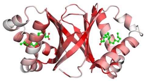 Structure of the bacterial antitoxin protein GhoS. GhoS inhibits the production of a bacterial toxin, GhoT, which can contribute to antibiotic resistance. GhoS is the first known bacterial antitoxin that works by cleaving the messenger RNA that carries the instructions for making the toxin. More information can be found in the paper: Wang X, Lord DM, Cheng HY, Osbourne DO, Hong SH, Sanchez-Torres V, Quiroga C, Zheng K, Herrmann T, Peti W, Benedik MJ, Page R, Wood TK. A new type V toxin-antitoxin system where mRNA for toxin GhoT is cleaved by antitoxin GhoS. Nat Chem Biol. 2012 Oct;8(10):855-61. Related to 3427.