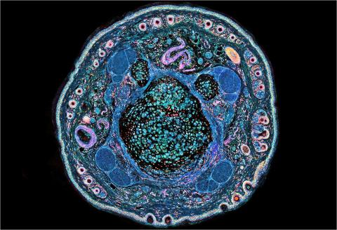 A light organ (~0.5 mm across) of a Hawaiian bobtail squid, Euprymna scolopes, with different tissues are stained various colors. The two pairs of ciliated appendages, or “arms,” on the sides of the organ move Vibrio fischeri bacterial cells closer to the two sets of three pores (two seen in this image) at the base of the arms that each lead to an interior crypt. This image was taken using a confocal fluorescence microscope.